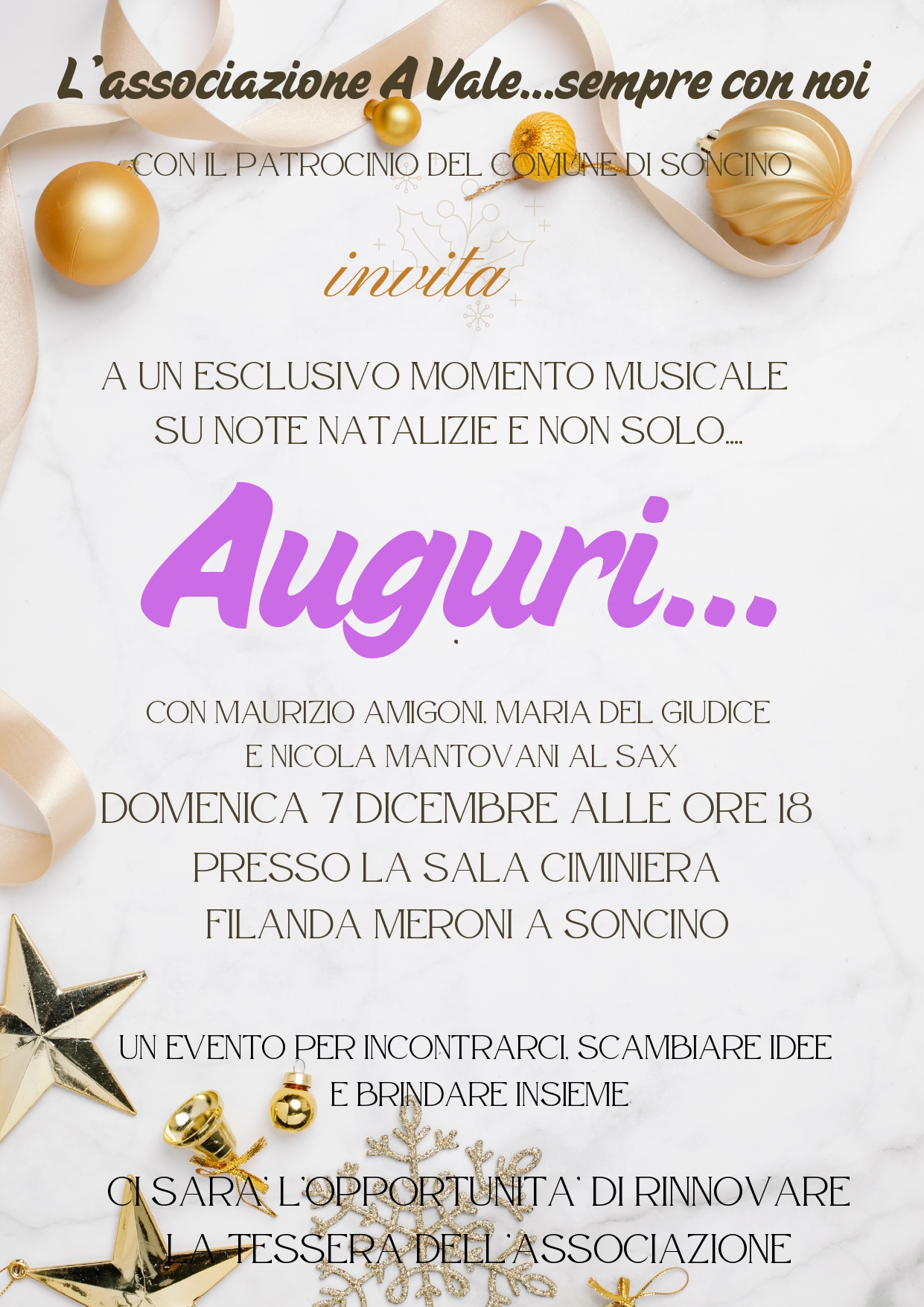 L'associazione "A Vale... sempre con noi", con il patrocinio del comune di Soncino, invita ad un esclusivo momento musicale su note natalizie e non solo.