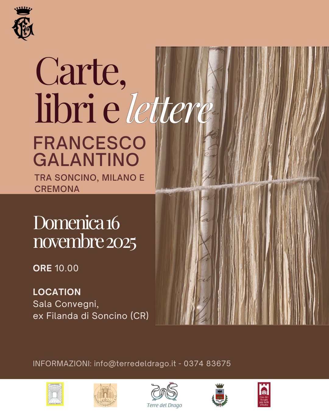 Francesco Galantino, colui che scrisse la "Storia di Soncino". Un convegno a cura dell'Associazione Castrum Soncini e Terre del Drago che indaga la vita dello storiografo tra i centri di Soncino, Cremona e Milano.