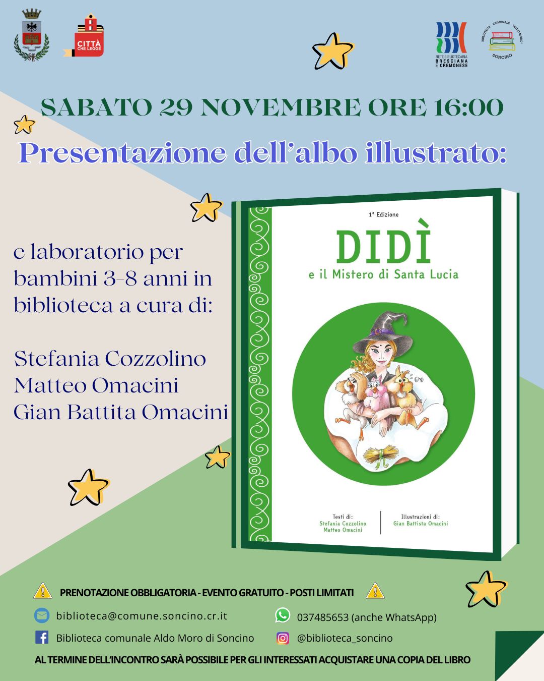 "Didì e il Mistero di Santa Lucia", libro di Stefania Cozzolino, Matteo Omacini e Gian Battista Omacini verrà presentato presso la Biblioteca Comunale insieme ad un laboratorio per bambini 3-8 anni.