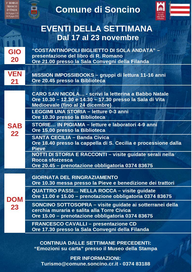 Eventi della settimana da lunedì 17 a domenica 23 novembre.