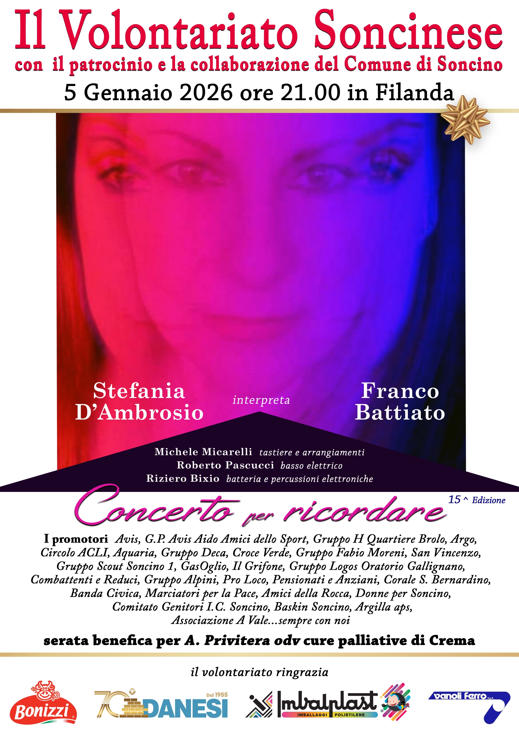 Il volontariato soncinese, con il patrocinio e la collaborazione del Comune di Soncino, presenta la 15° edizione del "Concerto per ricordare" in una serata benefica a sostegno di A. Privitera odv cure palliative di Crema.
